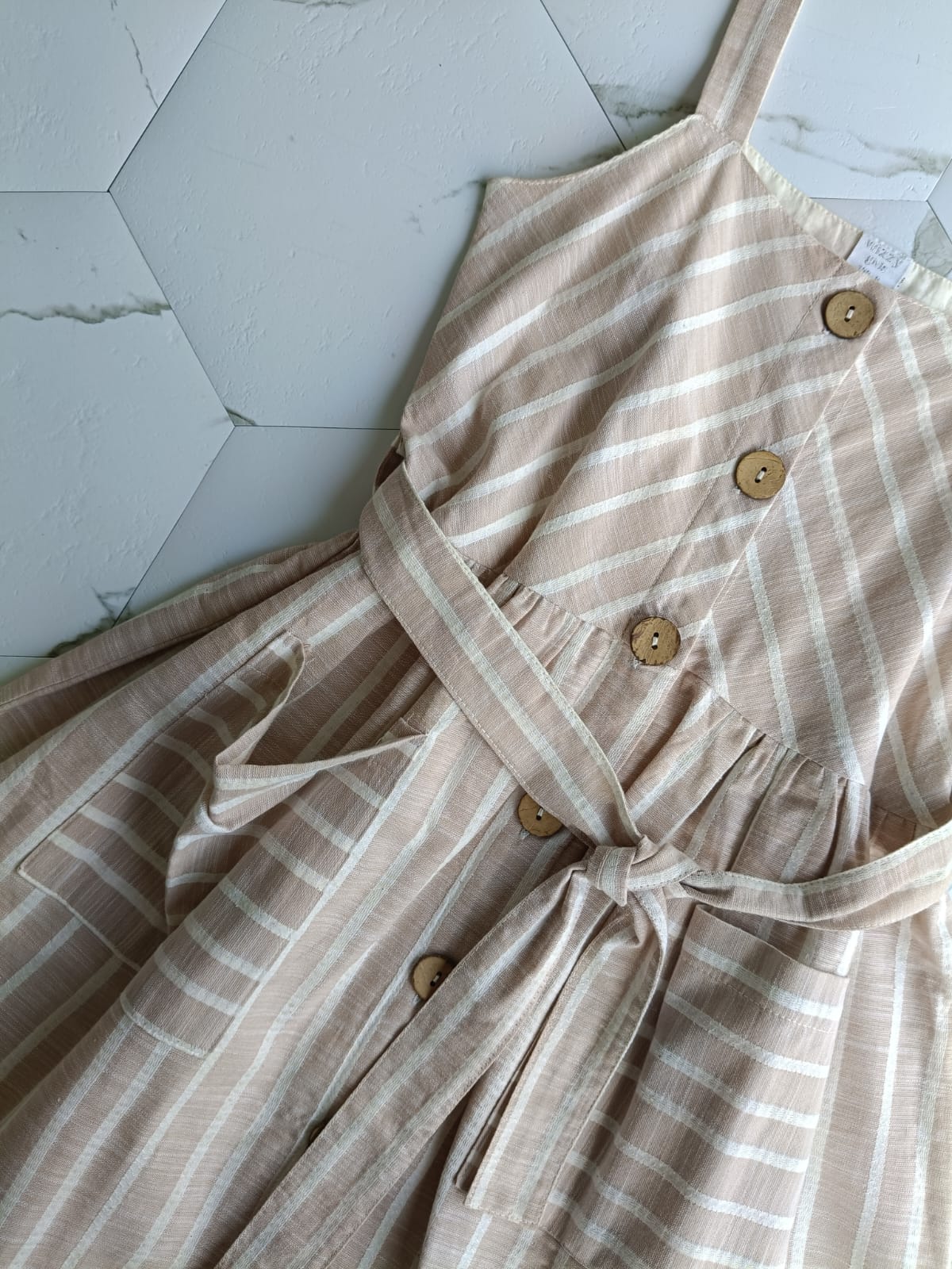 Elbisenin ana materyali ketendir. Keten kumaşın hafif ve nefes alabilir yapısı, vücudunuzu rahat ve serin tutarak gün boyu konforlu bir giyim deneyimi sunar. Askıları sayesinde kolayca takıp çıkarabilir ve bedeninize uygun şekilde ayarlayabilirsiniz. Ayrıca, çizgili desen tasarımıyla da dikkat çeken elbise, sade ve şık bir görünüm sunar.